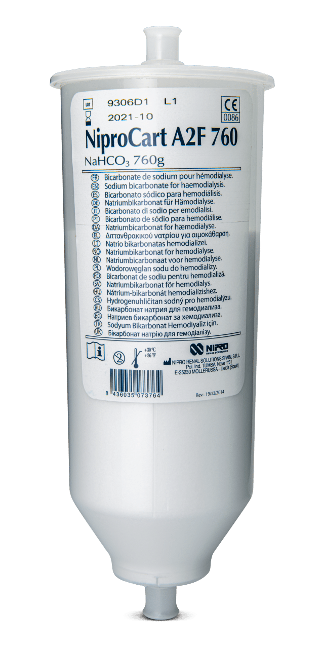 Niprocart is a cartridge containing sodium bicarbonate powder that produces dialysate online when combined with acid concentrate and pure water.