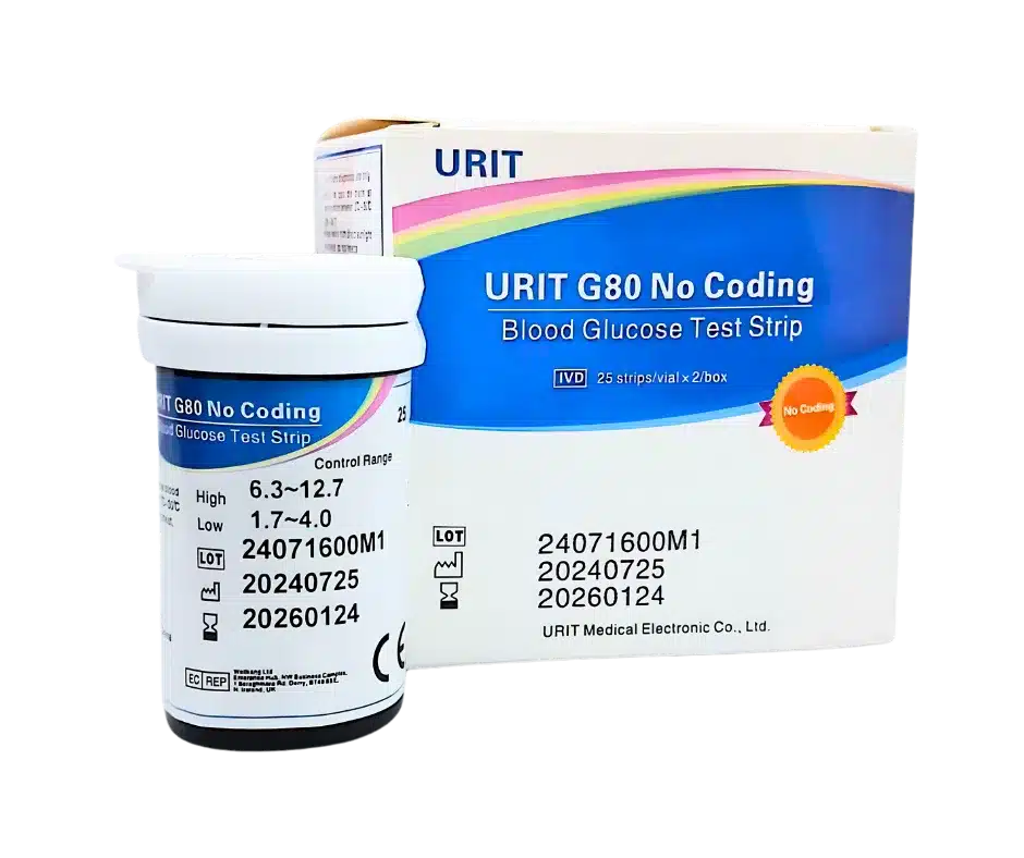 Urit G80 is no coding Blood Glucose test strip that used on Urit 82 Blood Glucose Meter. This test strip does not need the insertion of a code card to match with Urit 82 for test preparation.